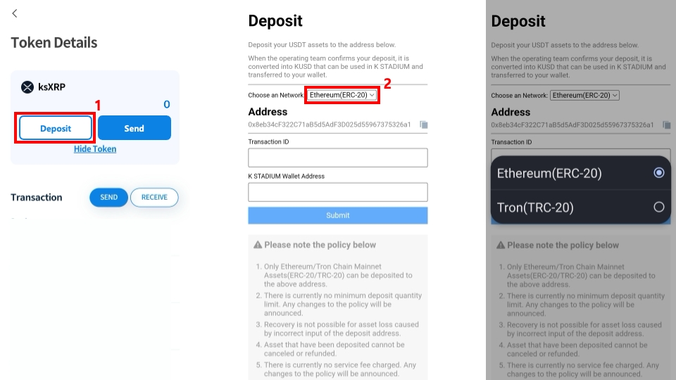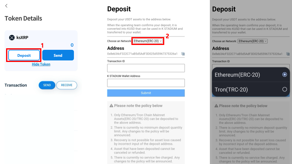 Select your deposit network. (Currently, deposits from the Ethereum/Tron network are supported.)