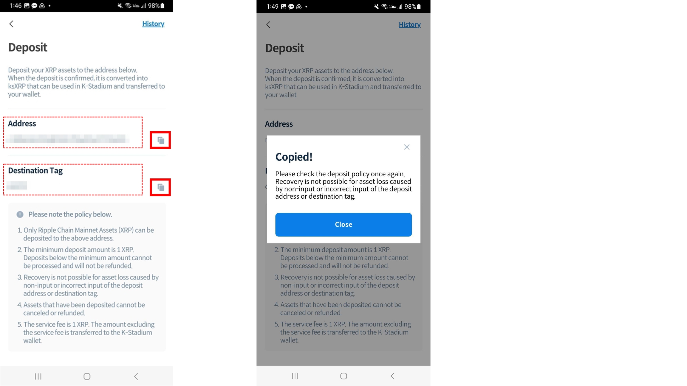 Copy the Address and Destination Tag (MEMO) shown on the screen and paste it into the exchange/wallet where you withdraw XRP.