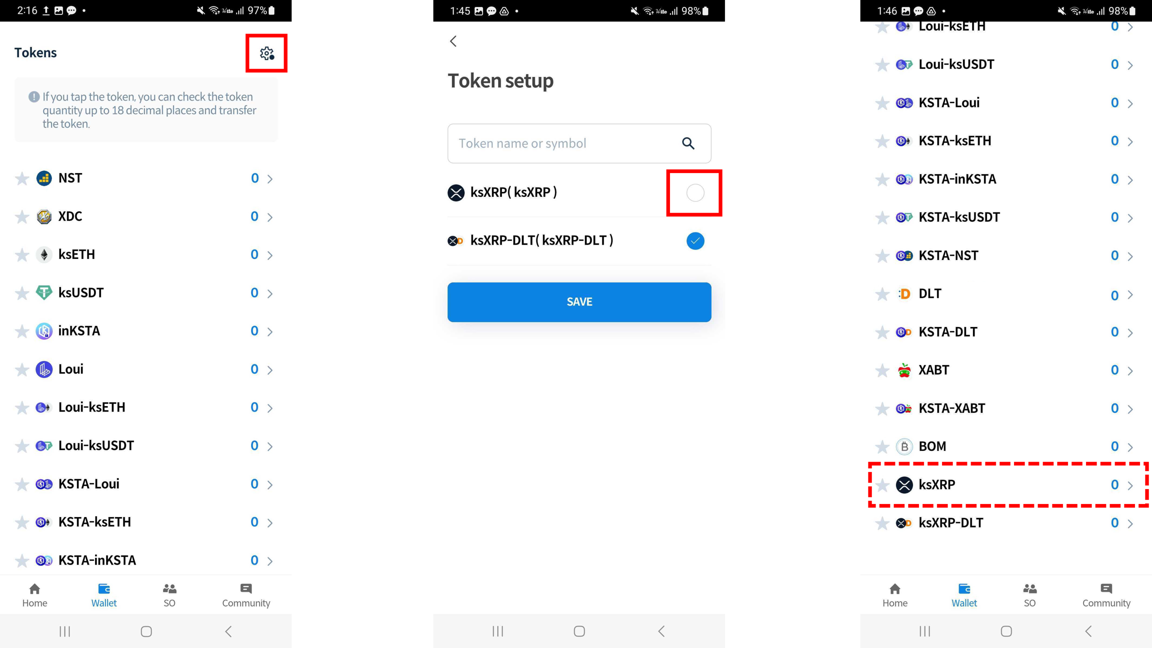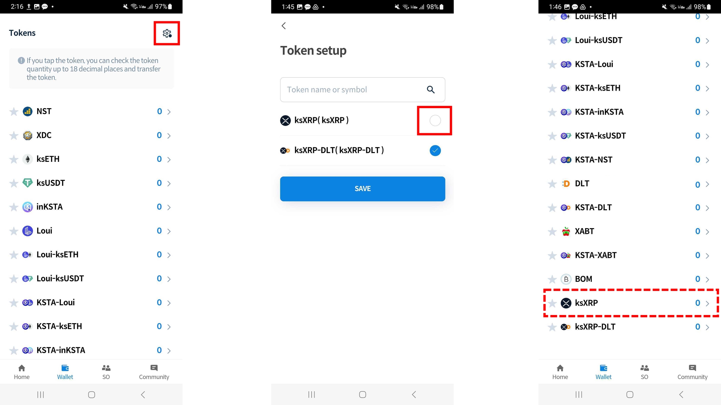 If you can't find ksXRP in the Tokens section, tap Setting to add the ksXRP.