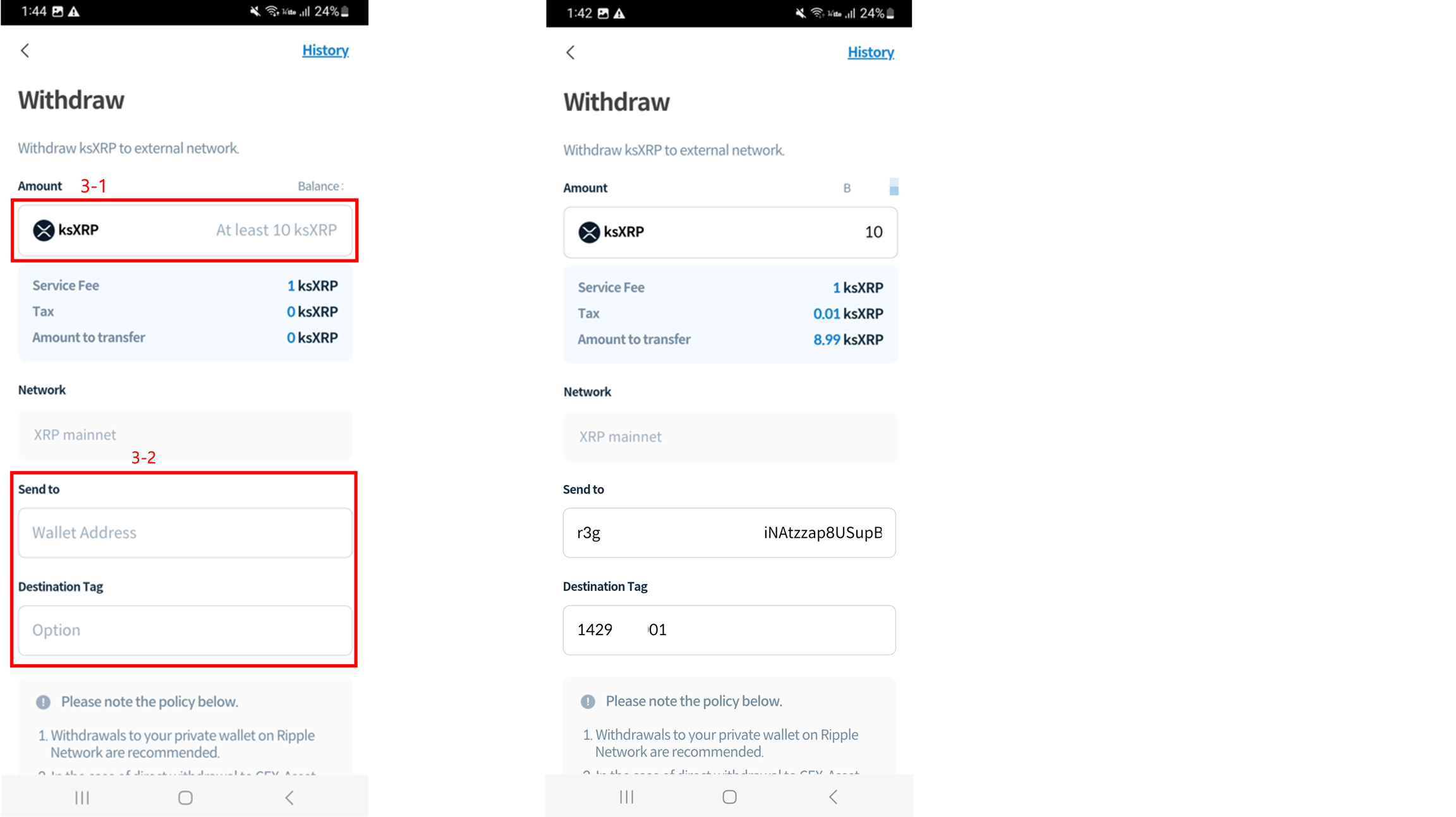 In case of withdrawal, the minimum transfer amount is 10 ksXRP, and there will be 1 ksXRP fee and 0.1% tax.
