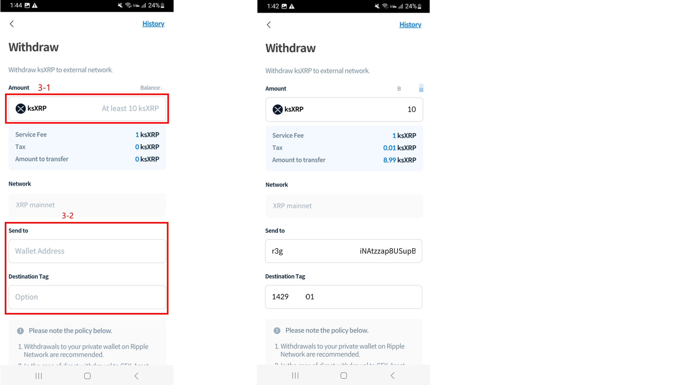3-2. Enter the Address and Destination Tag(MEMO) of the external wallet where you want to receive XRP