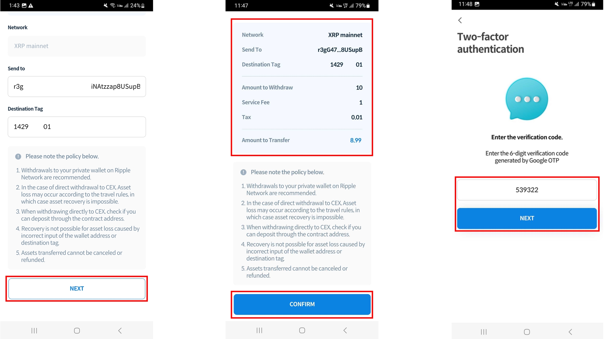 Tap ‘NEXT’ button, confirm the summary of your withdrawal information and enter your OTP verification