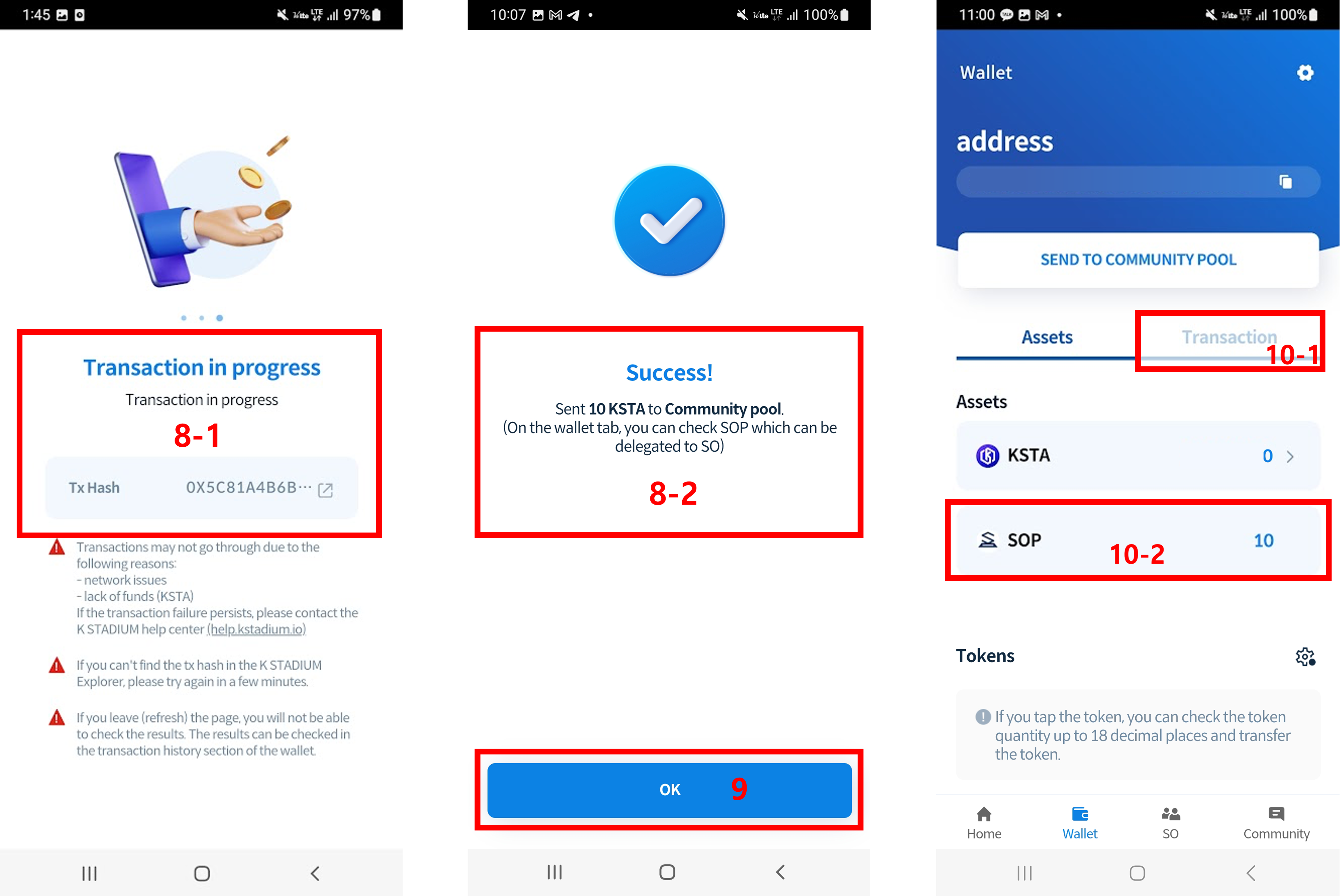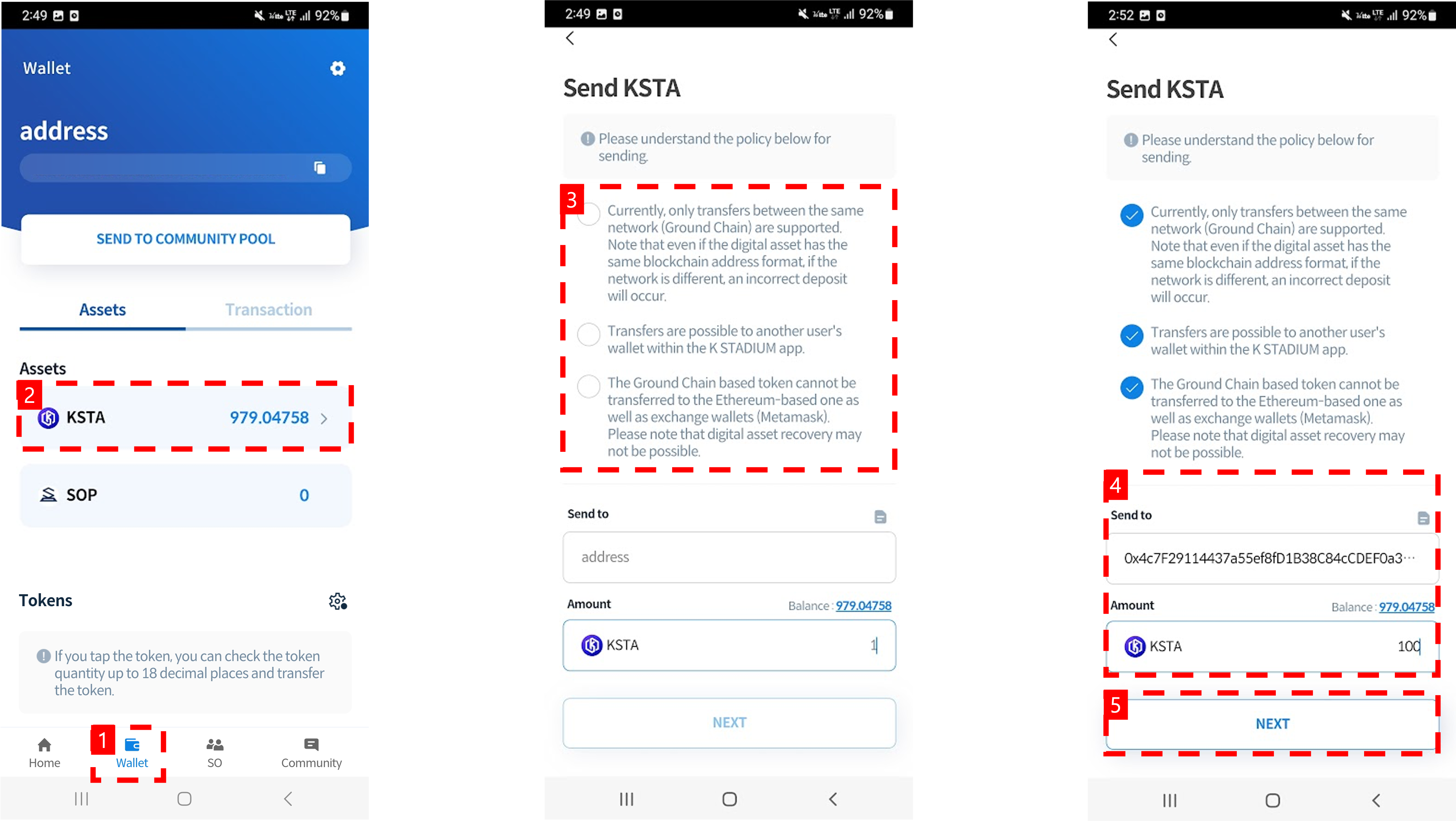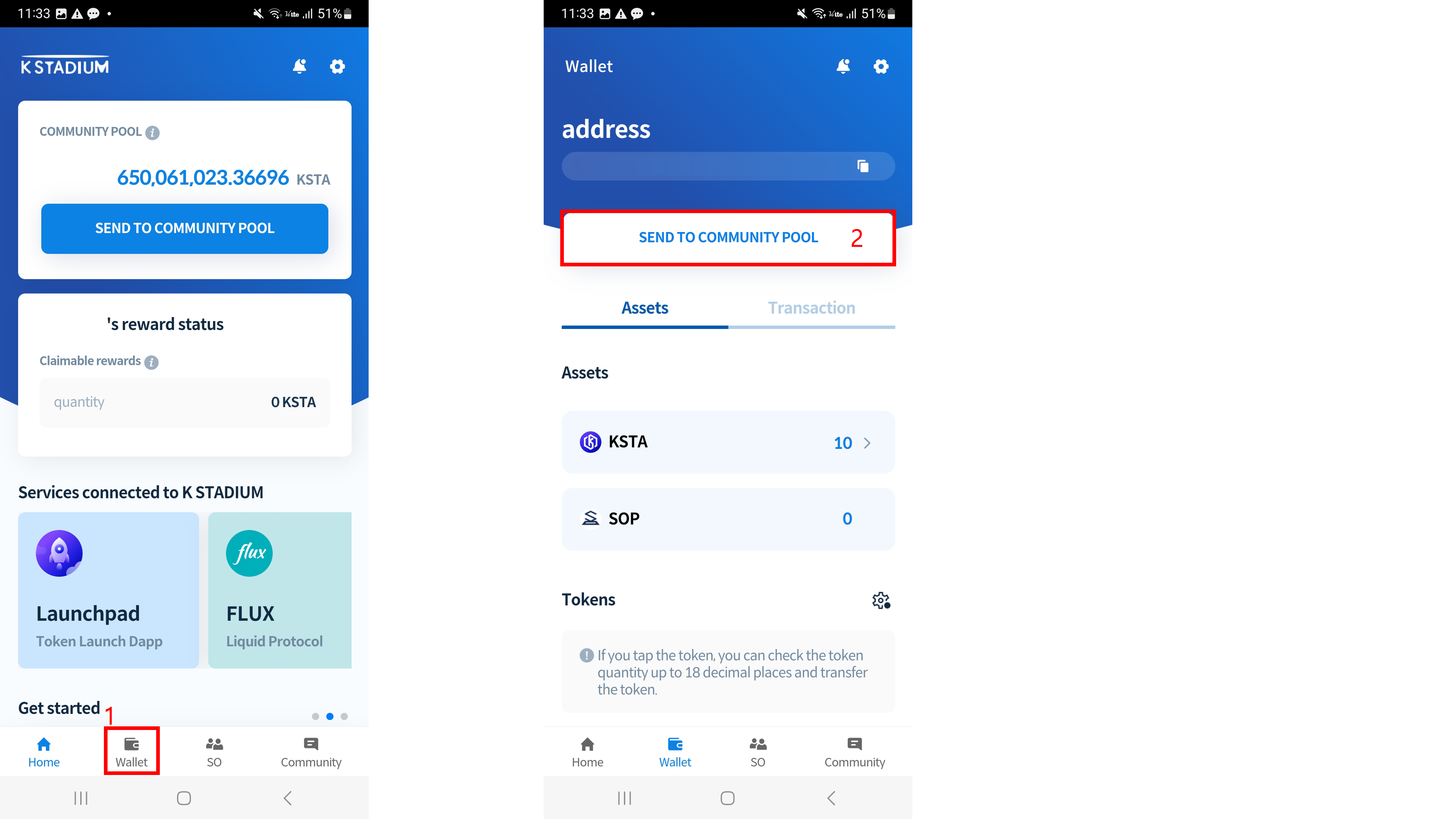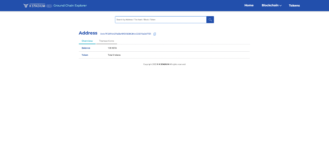The K STADIUM wallet address will automatically be generated after downloading the app and once membership registration is complete. The K STADIUM Wallet can be used for KSTA deposits, community pool transfers as well as reward withdrawals, etc.
