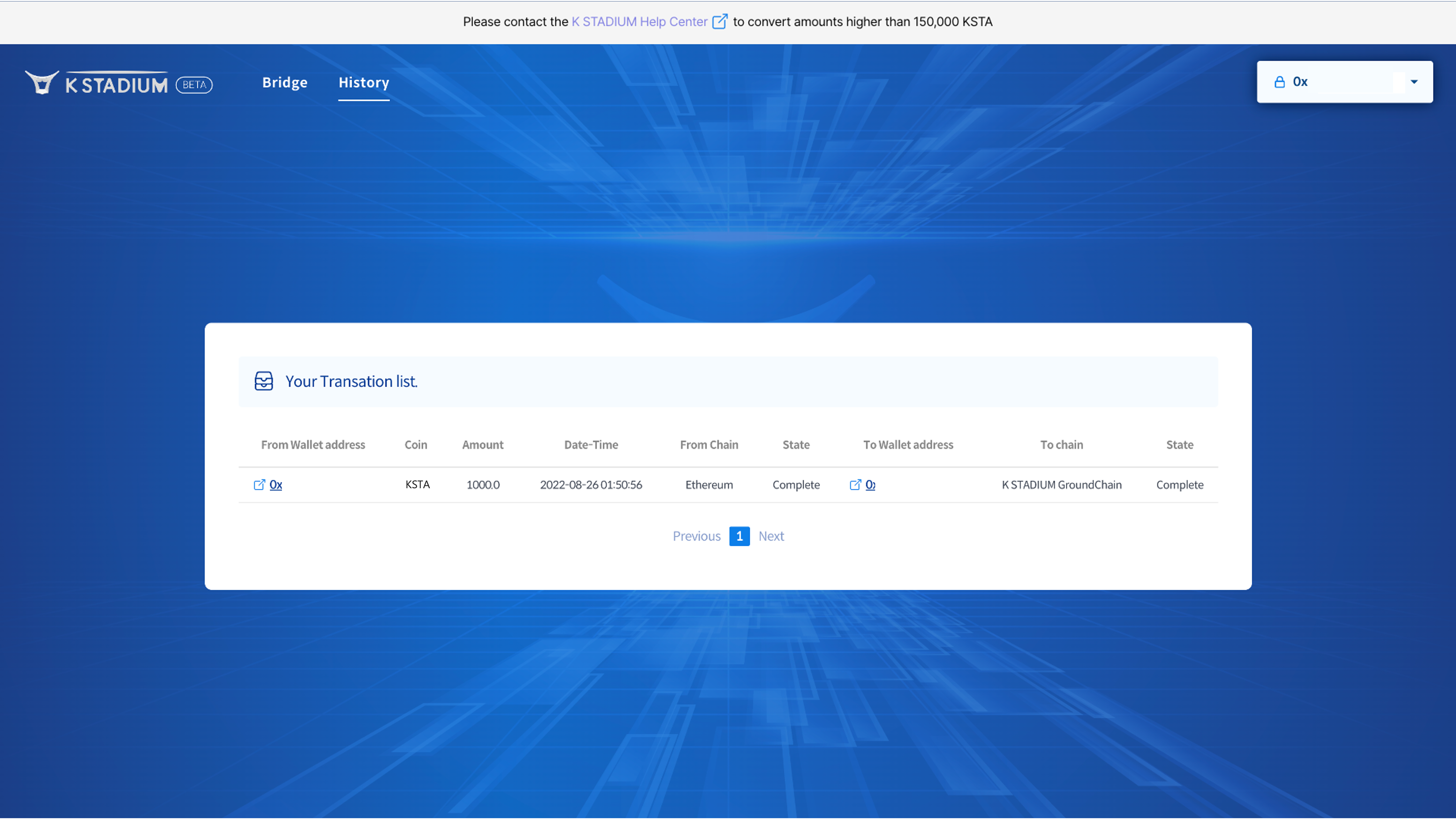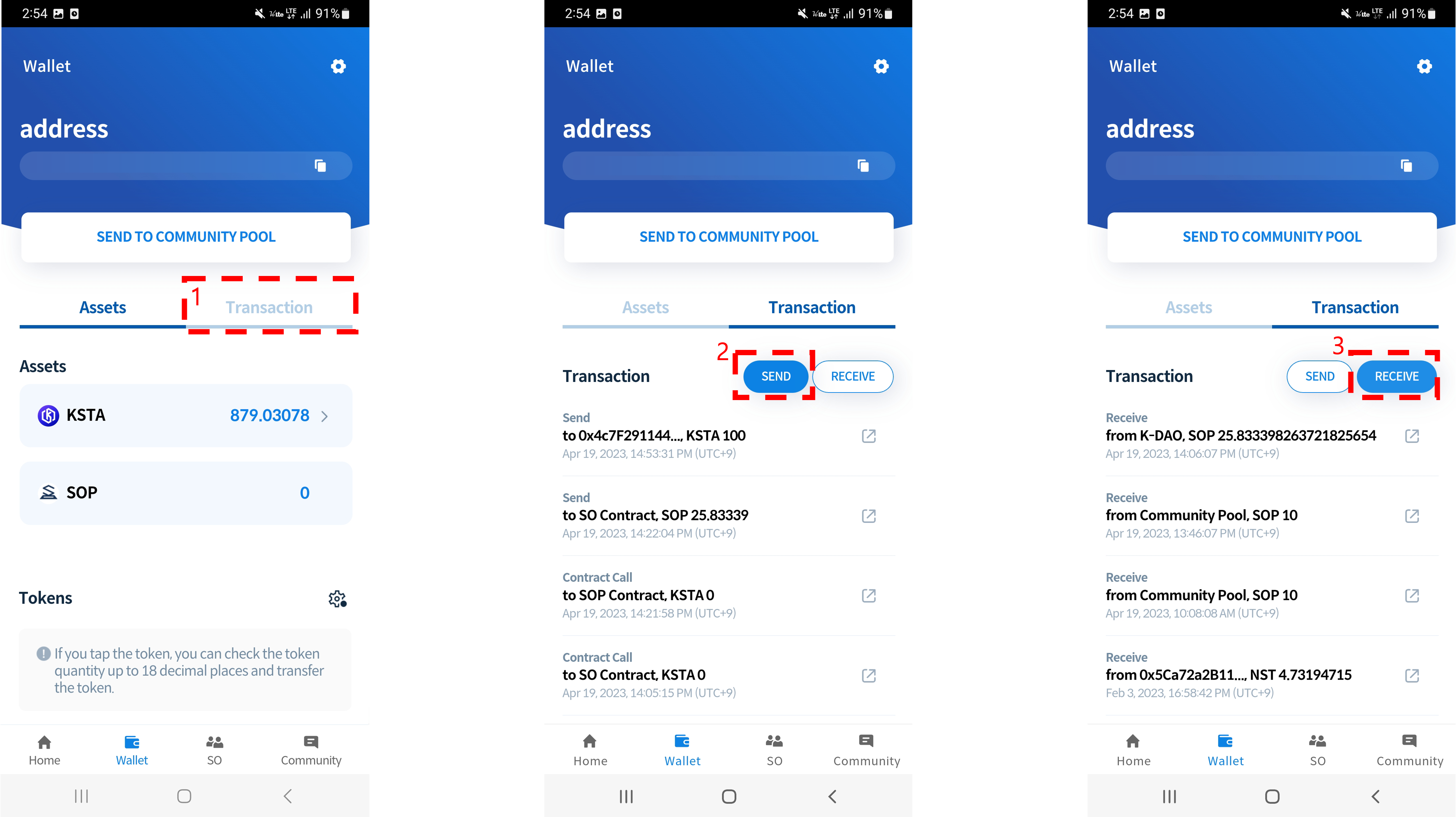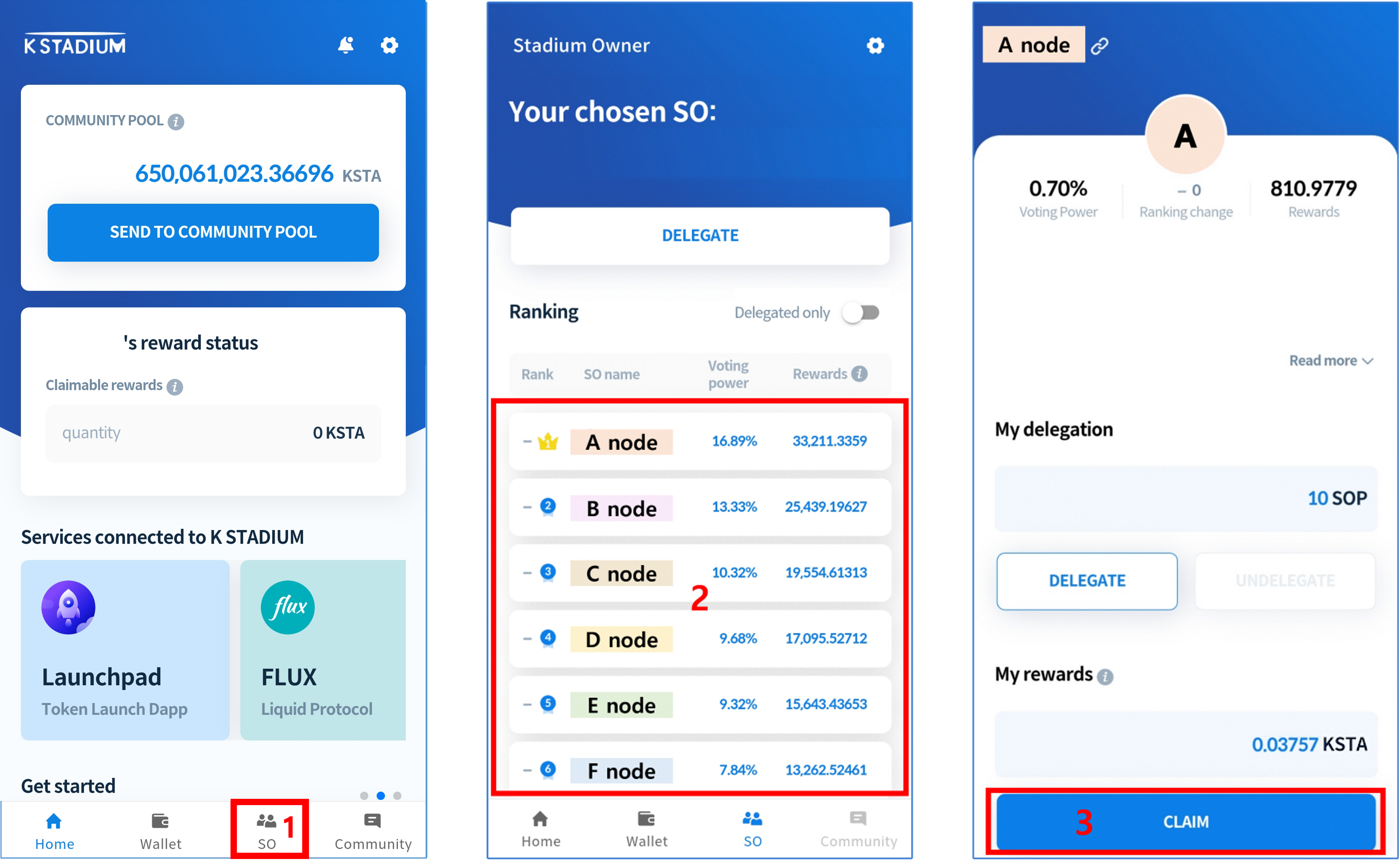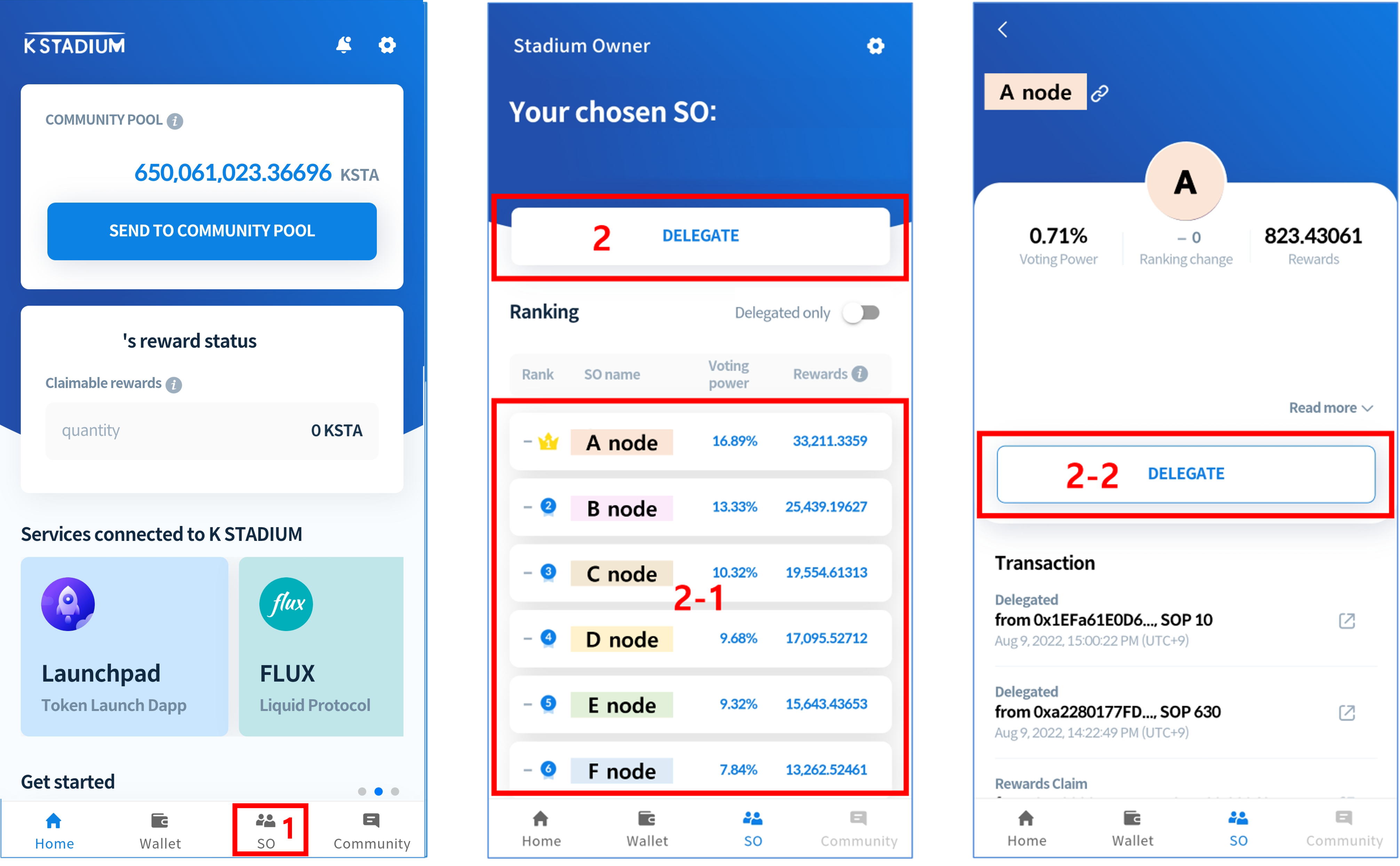 The K STADIUM wallet address will automatically be generated after downloading the app and once membership registration is complete. The K STADIUM Wallet can be used for KSTA deposits, community pool transfers as well as reward withdrawals, etc.