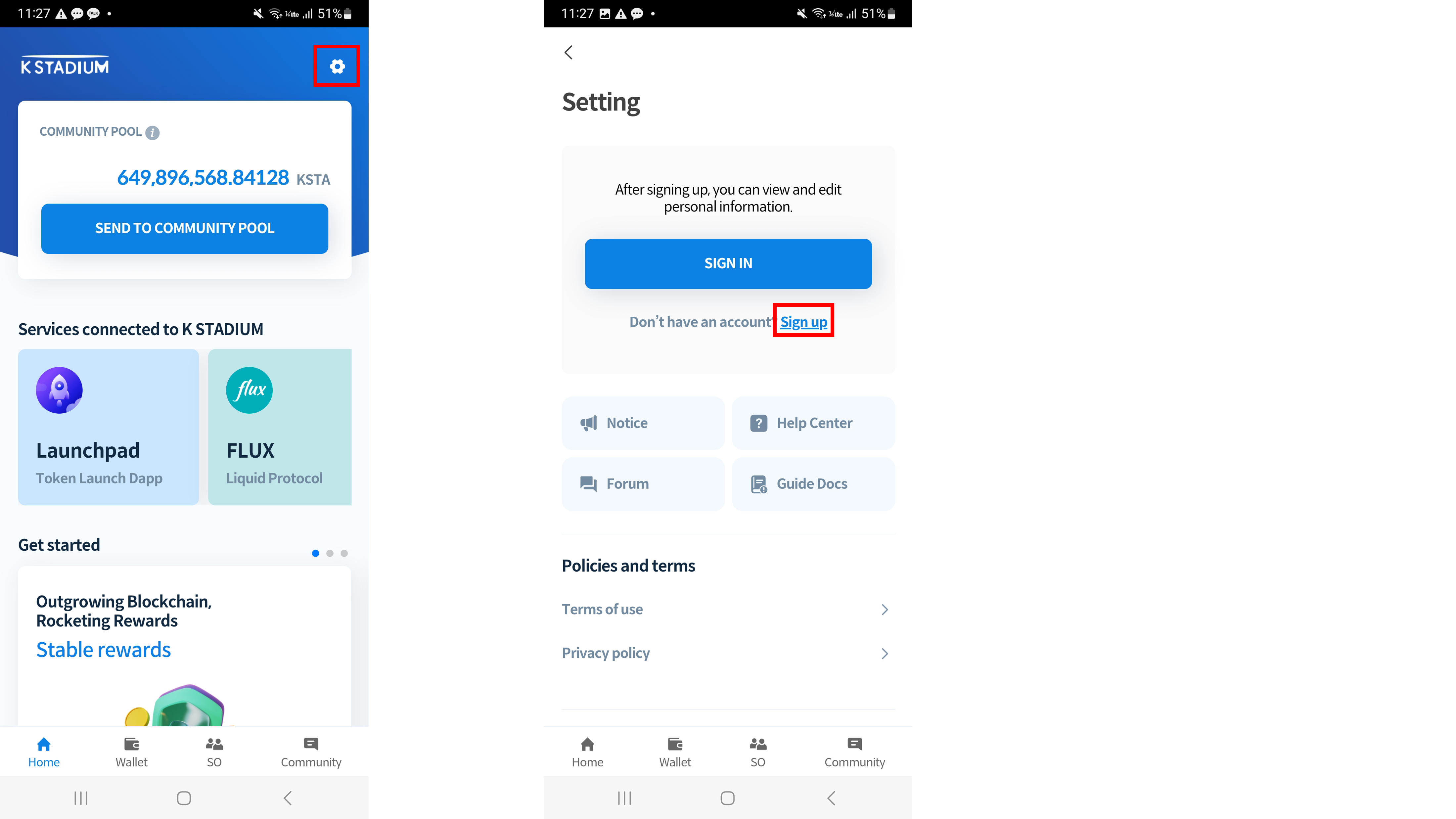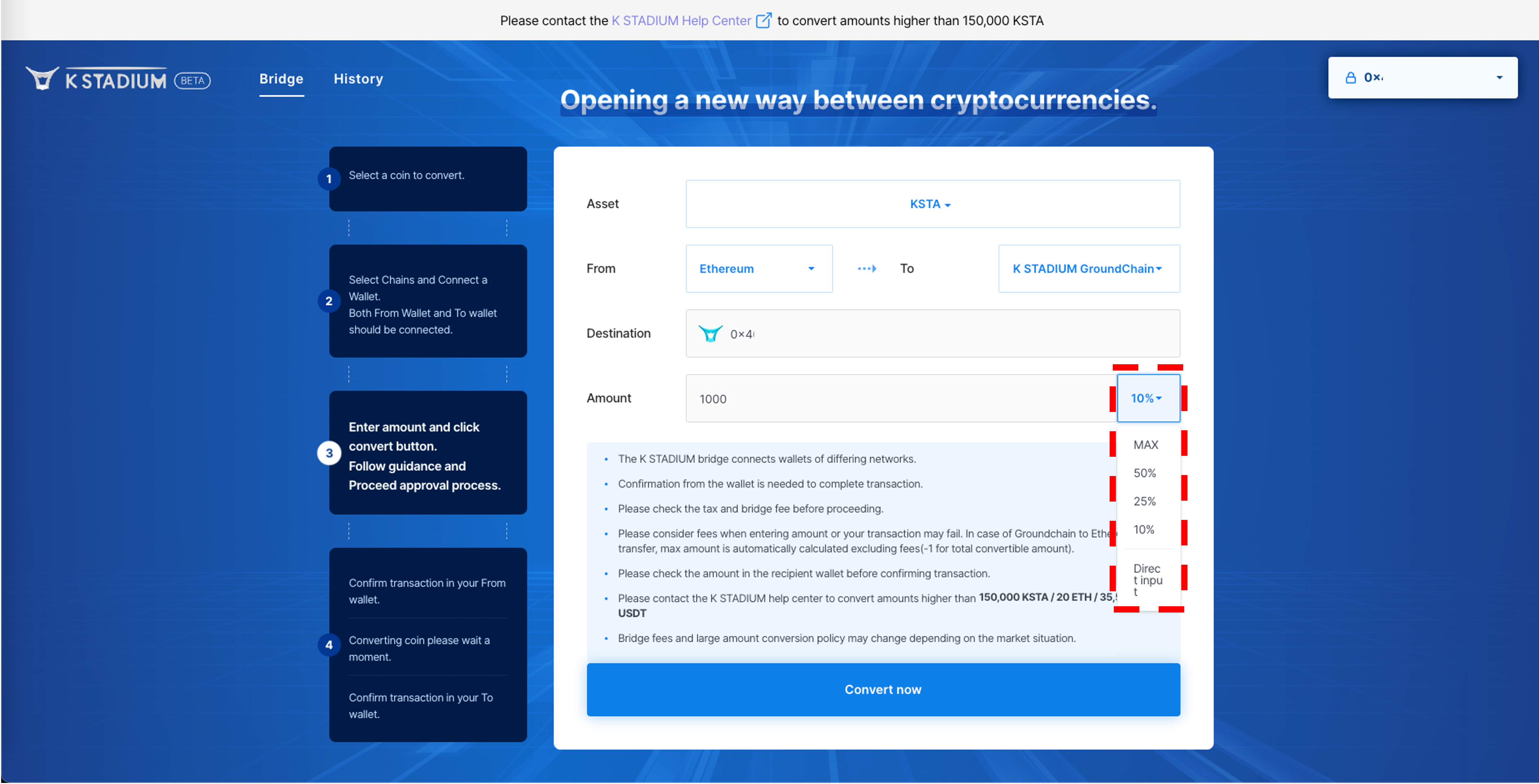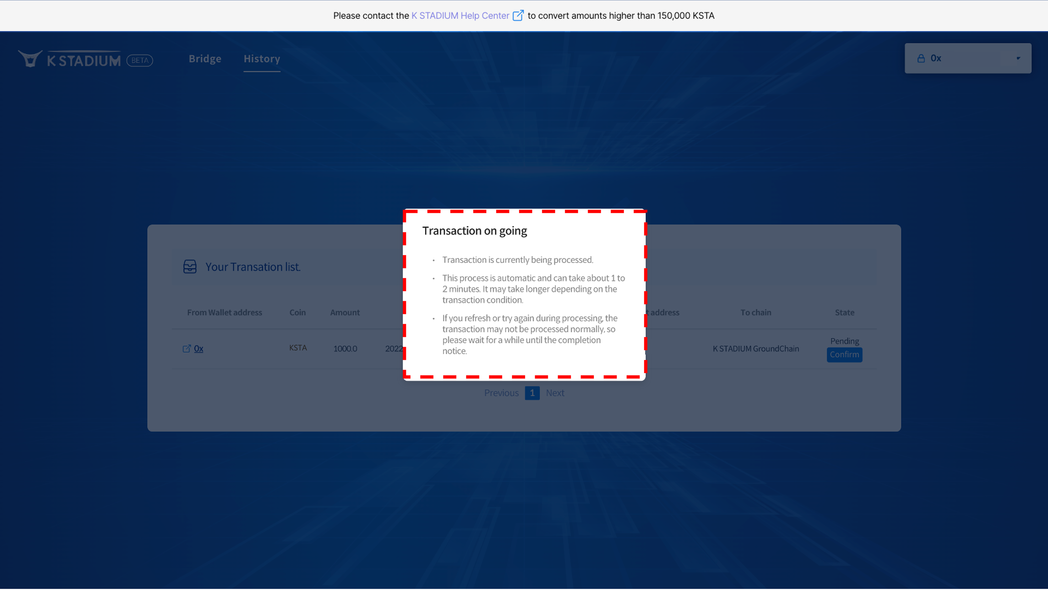 The K STADIUM wallet address will automatically be generated after downloading the app and once membership registration is complete. The K STADIUM Wallet can be used for KSTA deposits, community pool transfers as well as reward withdrawals, etc.