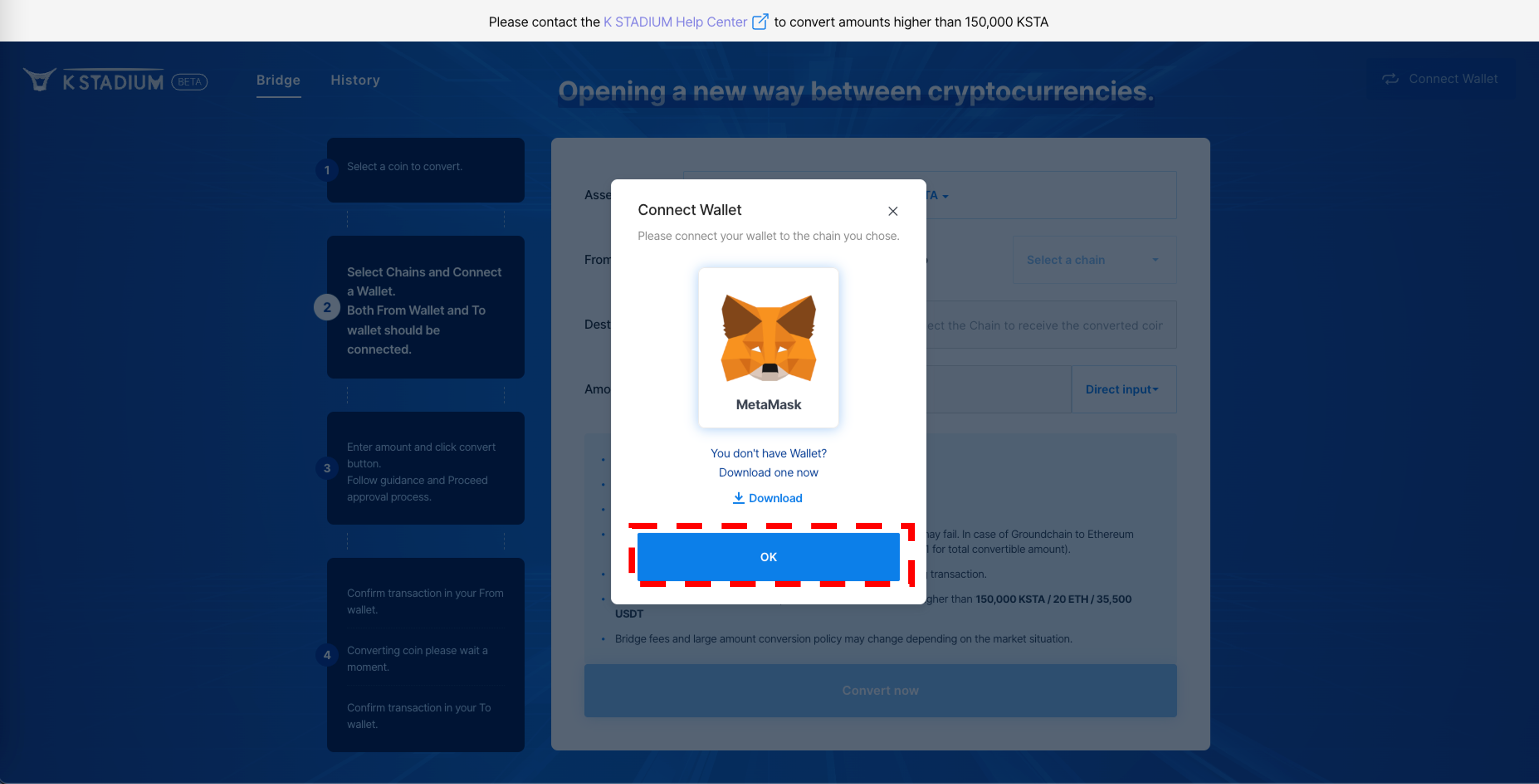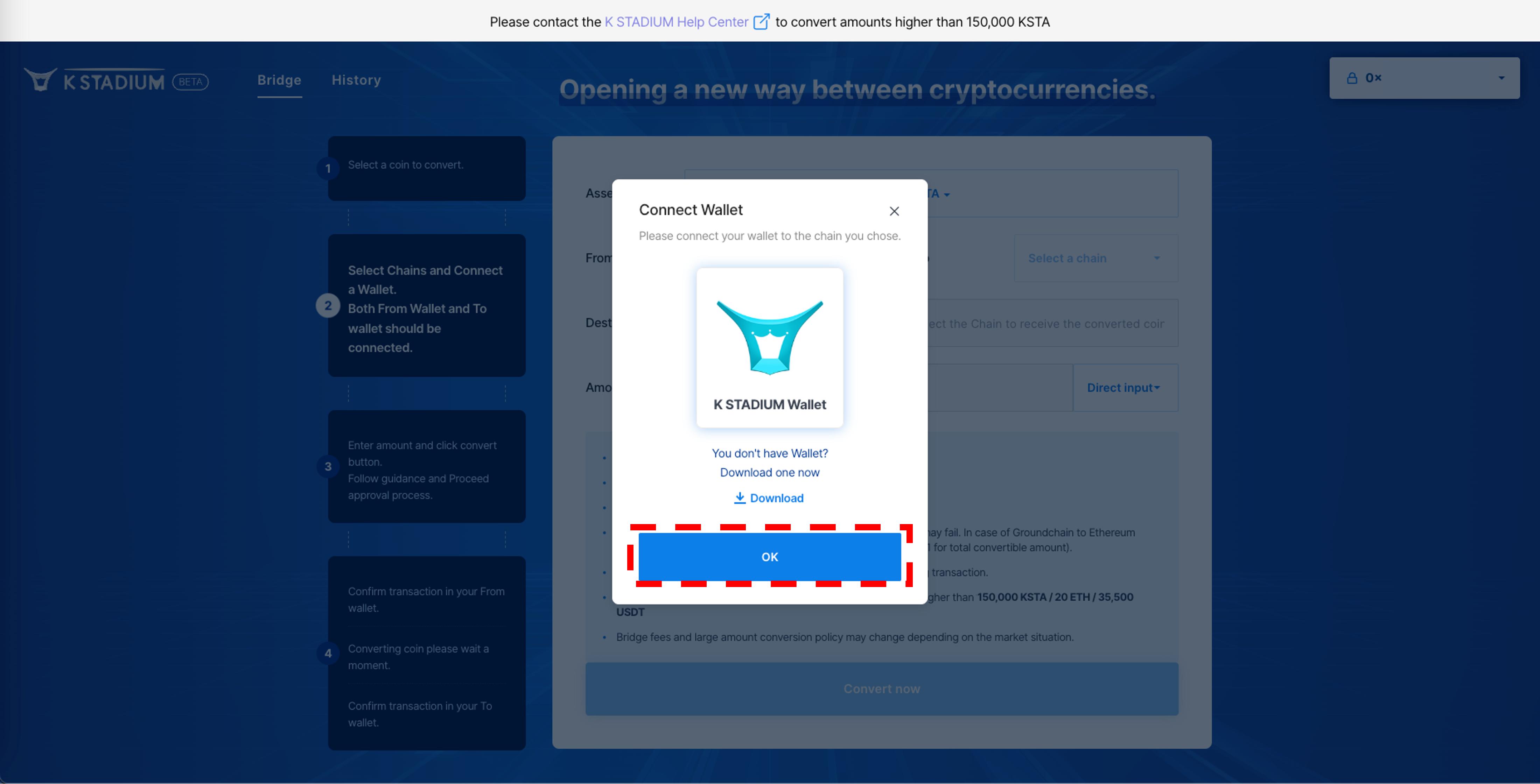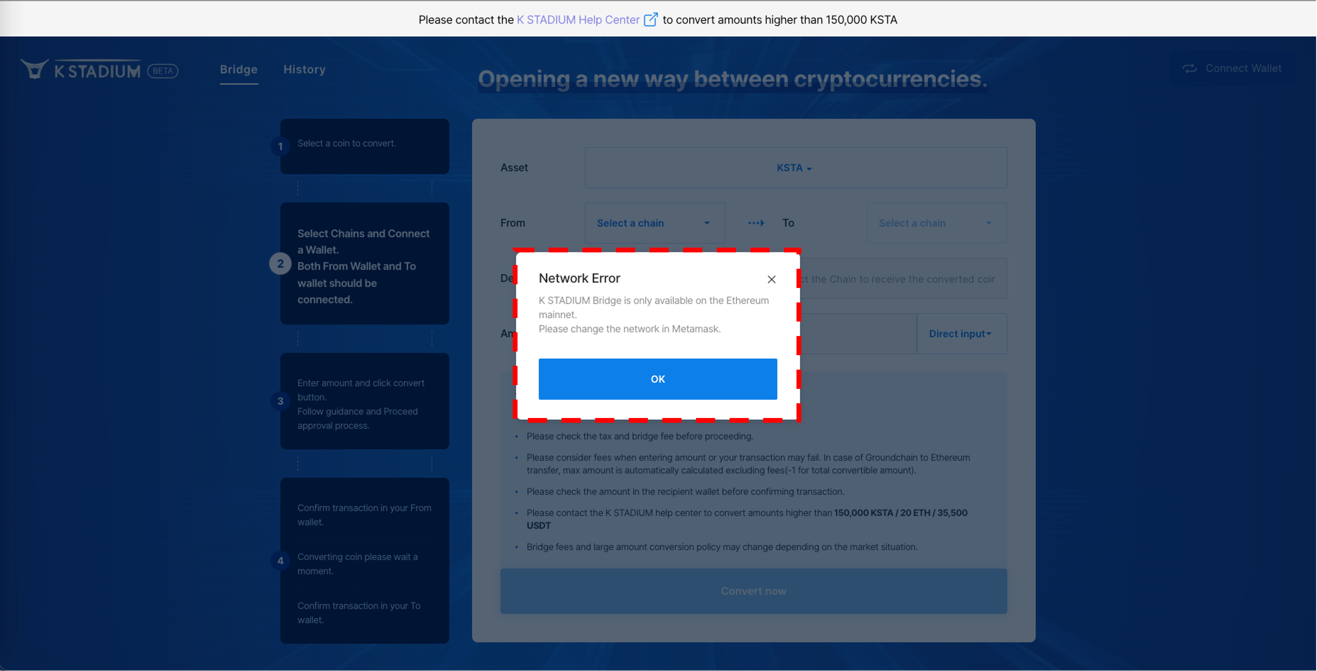 3\. Change KSTA's network using the Bridge. Please refer to [Use Bridge](https://docs.kstadium.io/broken-reference) for more information on how to use it.