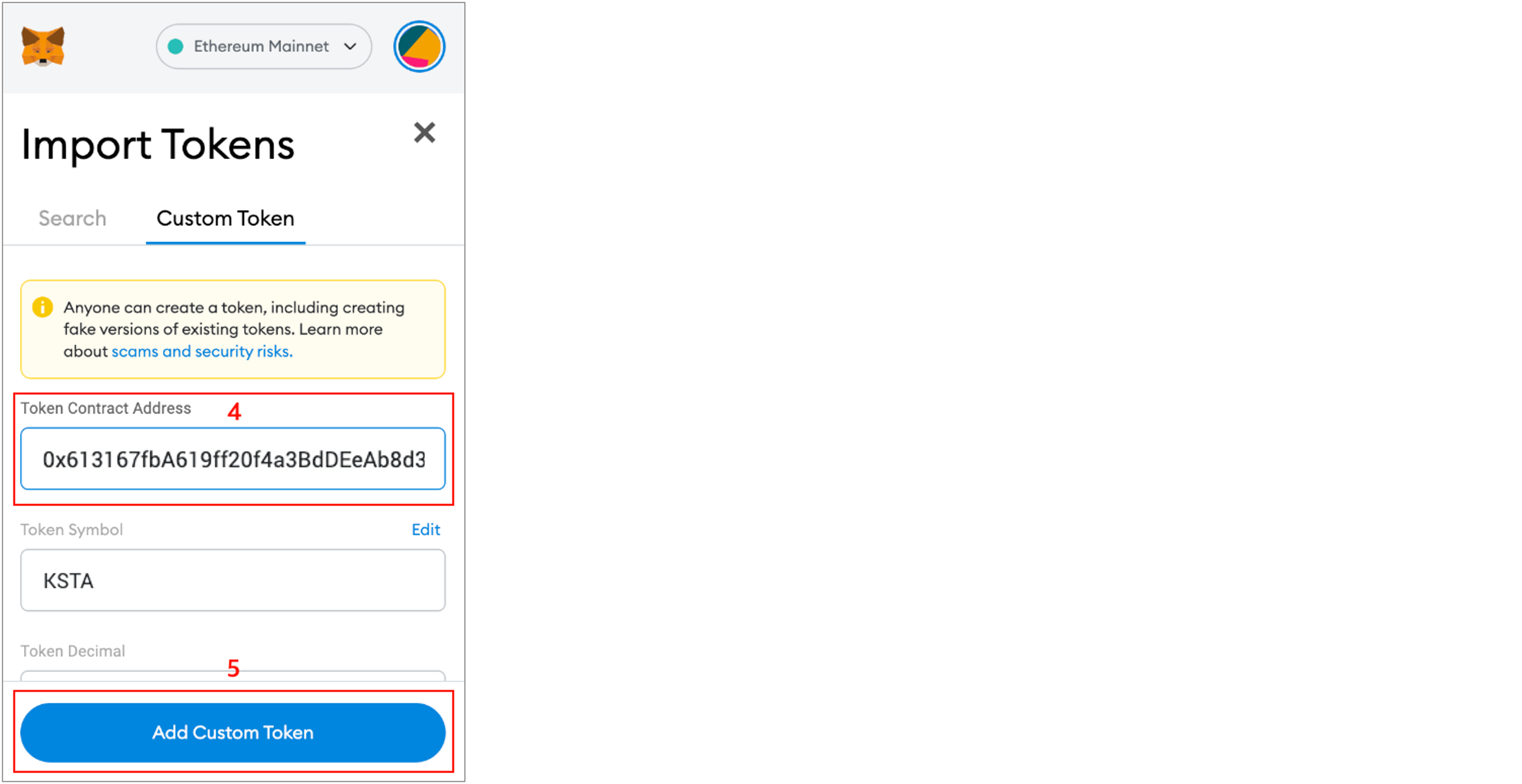 4\. Enter the KSTA and USDT Contract Address.