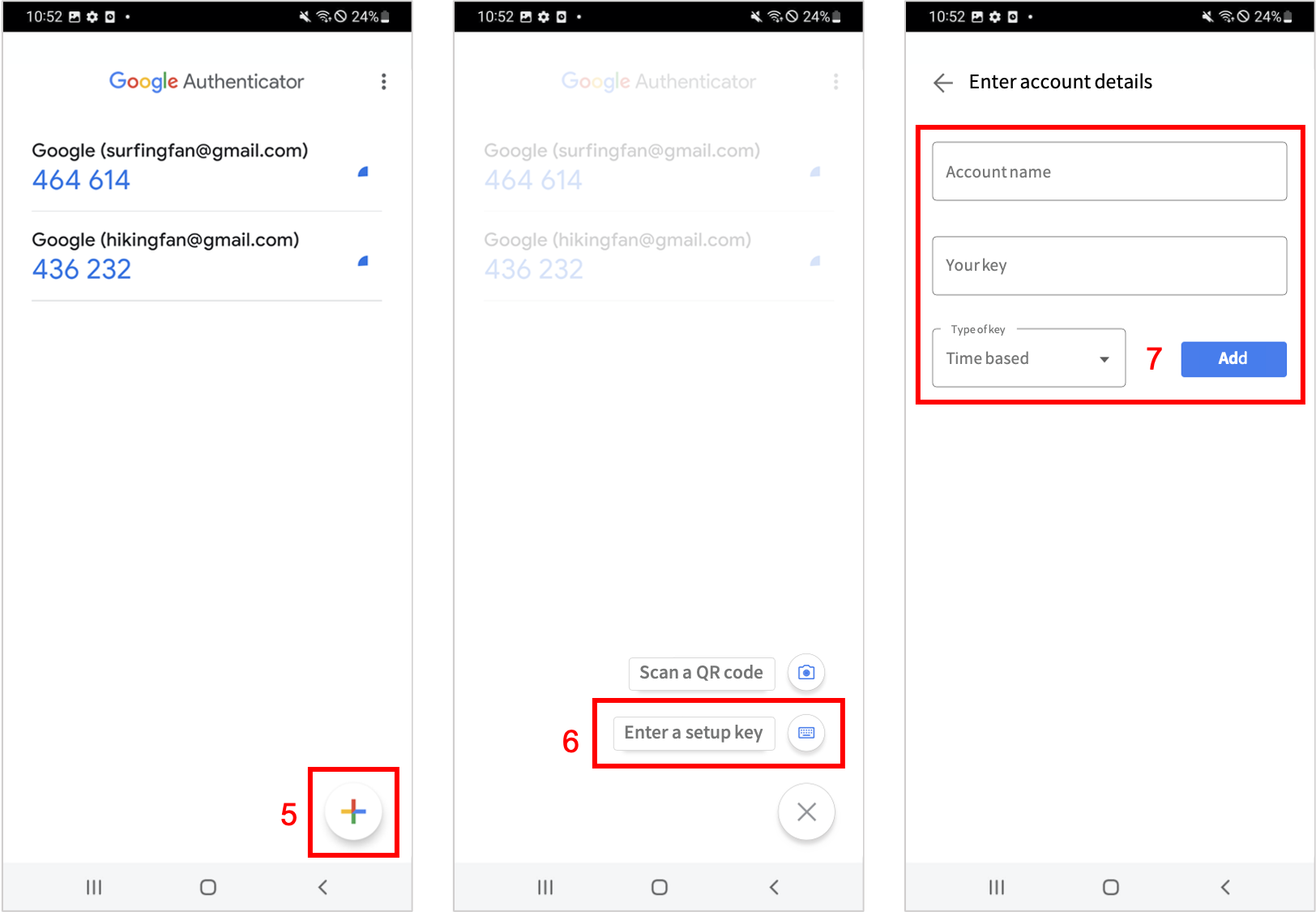 7\. Enter the name you want in the 'Account Name' field, paste the copied authentication key in the 'My Key' field, and click the Add button. (Key type supports only the 'by time' option.)