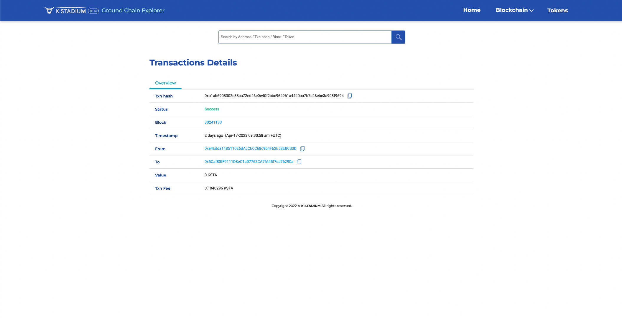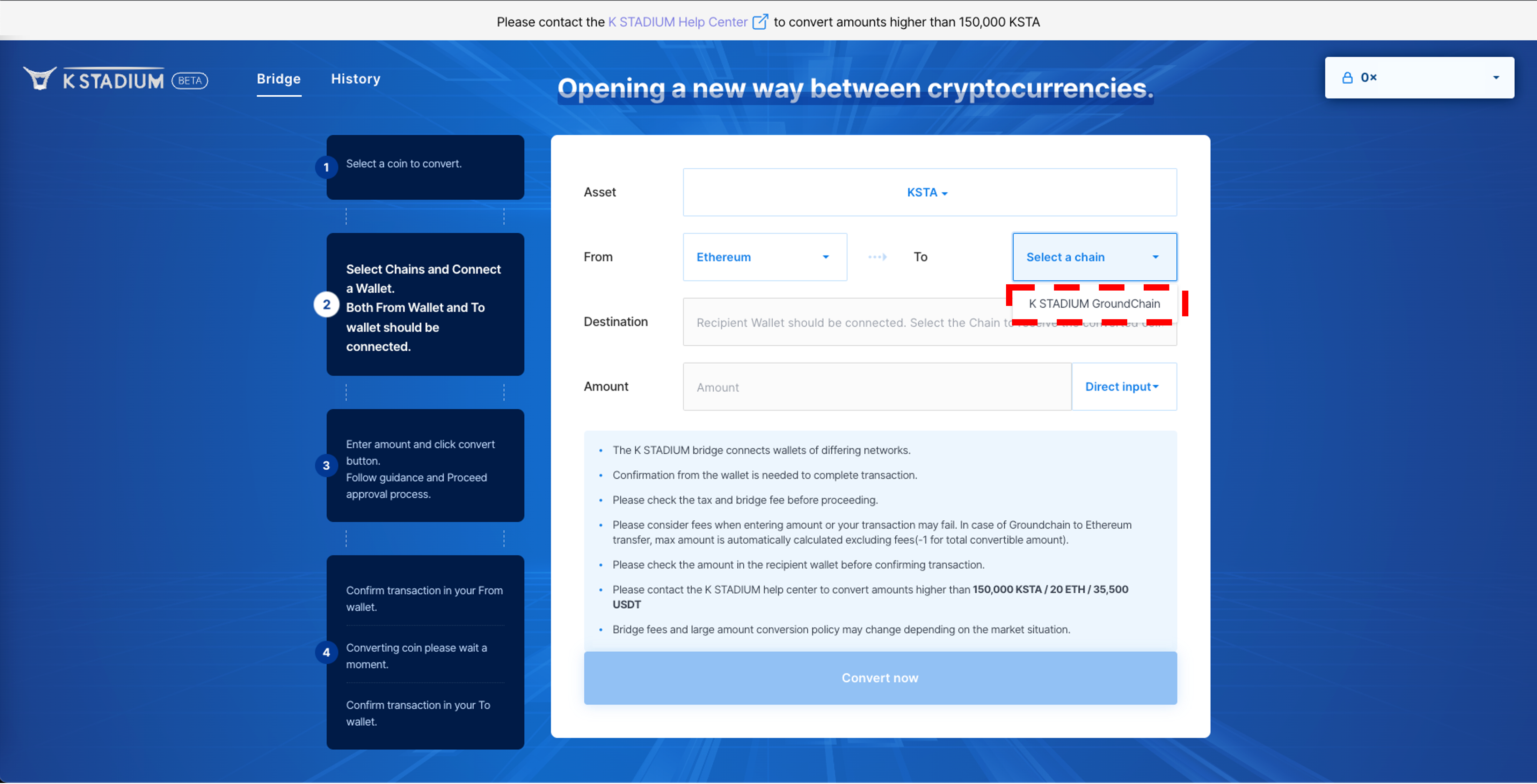 KSTADIUM APP uses the Groundchain network. Due to the nature of digital assets, recovery is not possible in case of an incorrect deposit. <mark style="color:red;background-color:red;">If you make a mistake, you can’t find crypto, so it is recommended to test conversion with a small amount of assets first.</mark> Also, even if the wallet address format of assets and Ethereum are the same, they do not use the same blockchain network, so please check the network type.