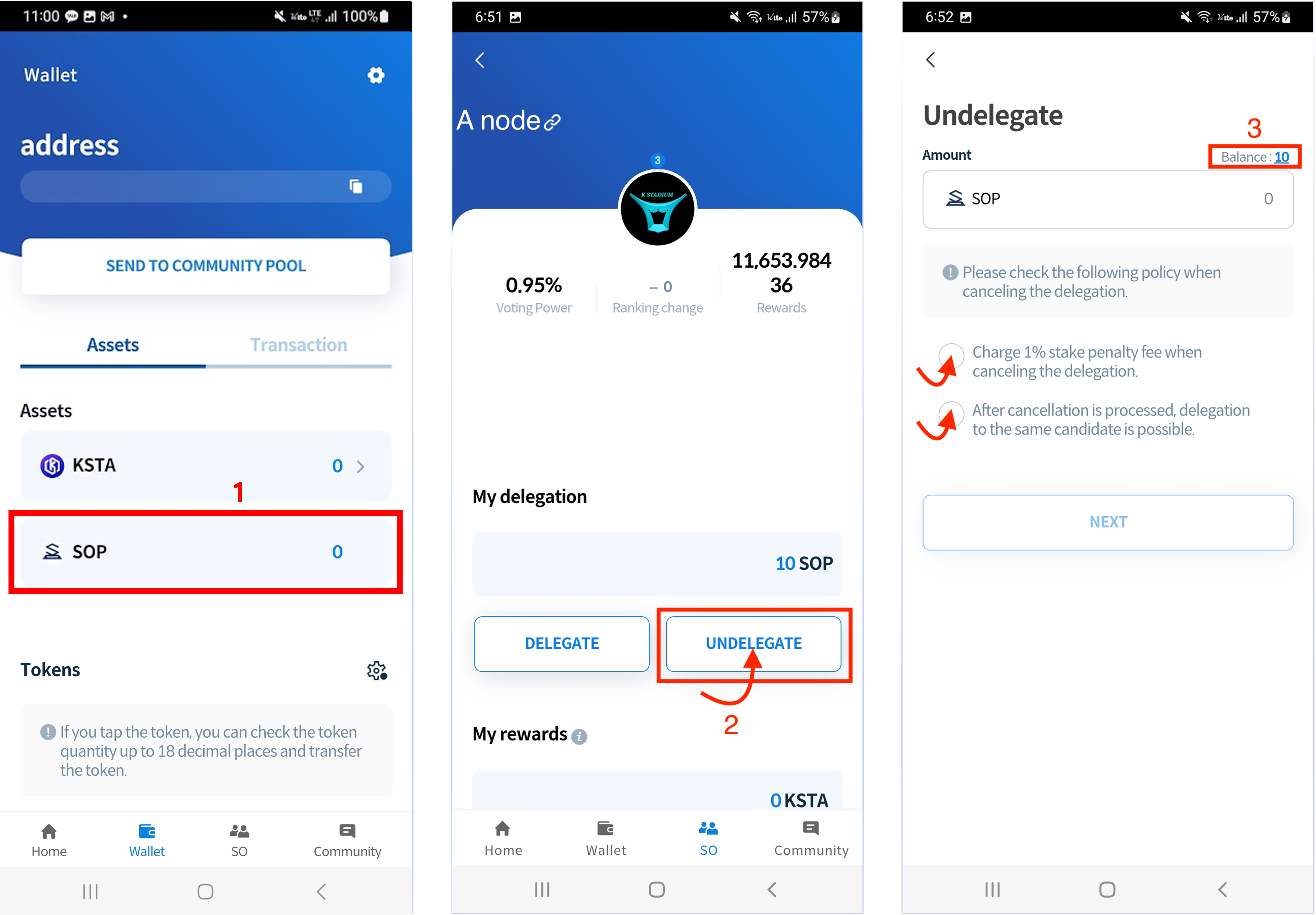 2\. Click the 'SO' tab at the bottom of the app, select the node you want to withdraw your delegation from among the list of nodes displayed, and then click the 'UNDELEGATE' button on the screen that appears.