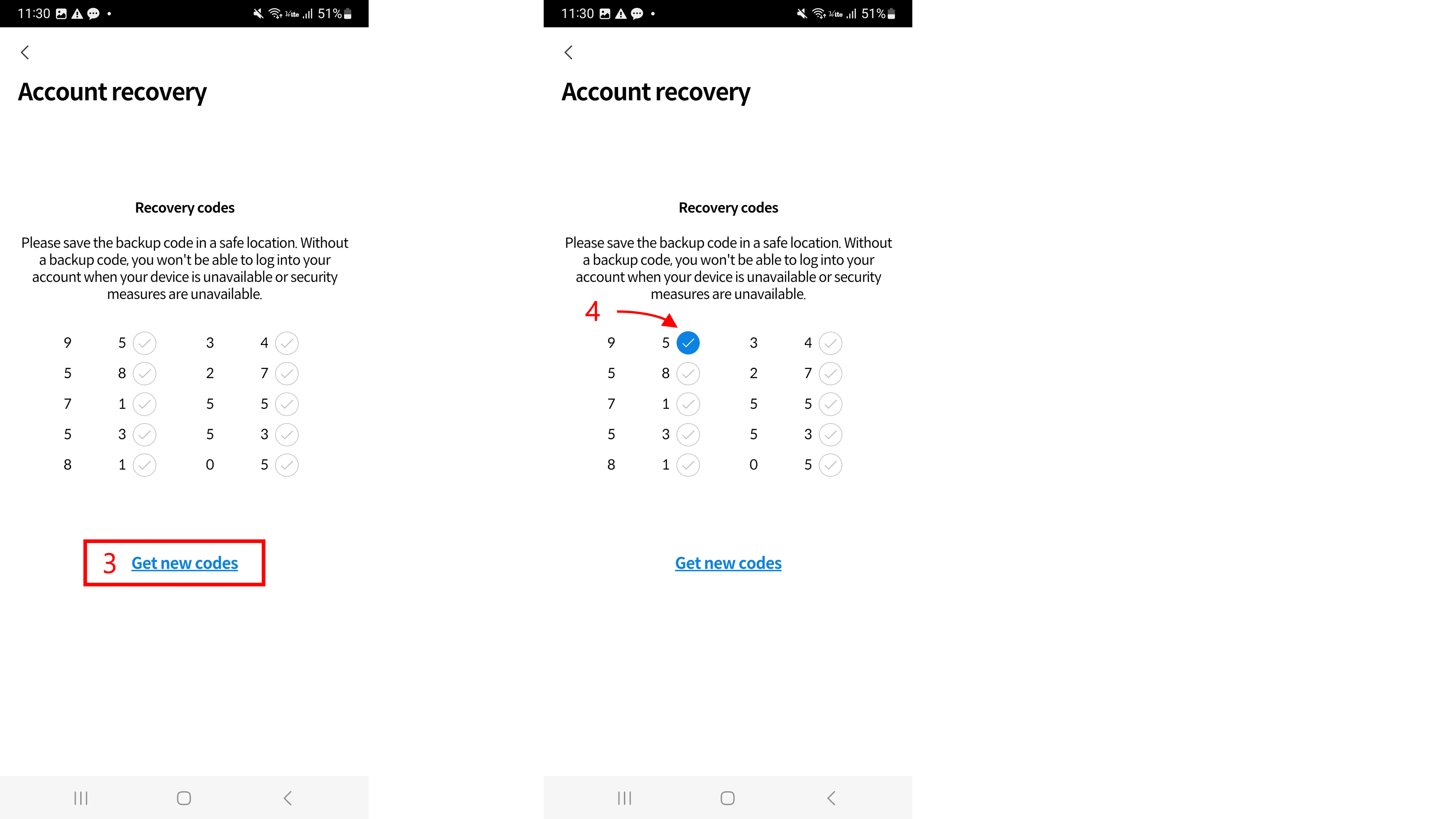 3\. If you press the 'Get new codes' button, the recovery code will be reset and a new code will be generated.